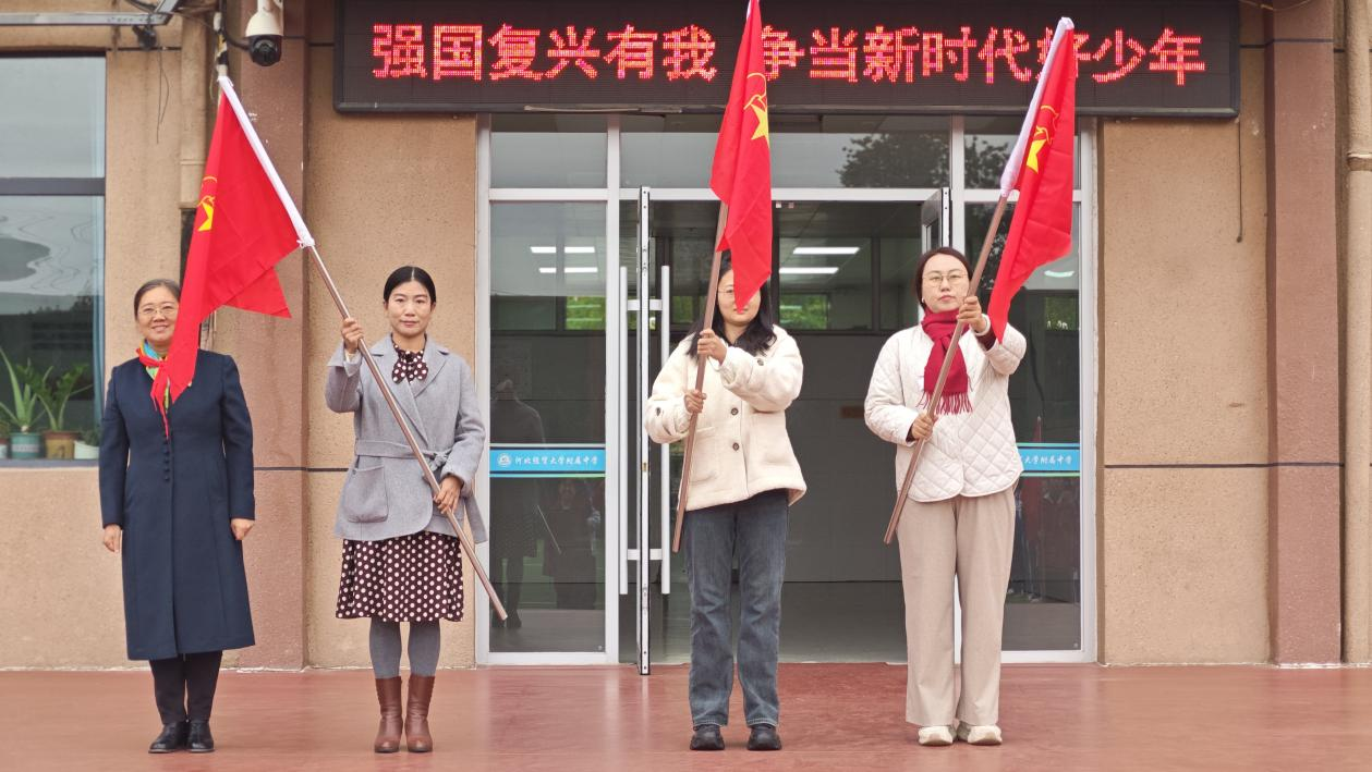 活动最后,校长冯丽宣布七年级 1 班、2 班、3 班中队正式成立,并为新任中队辅导员授予中队旗,崭新的中队旗迎风飘扬。