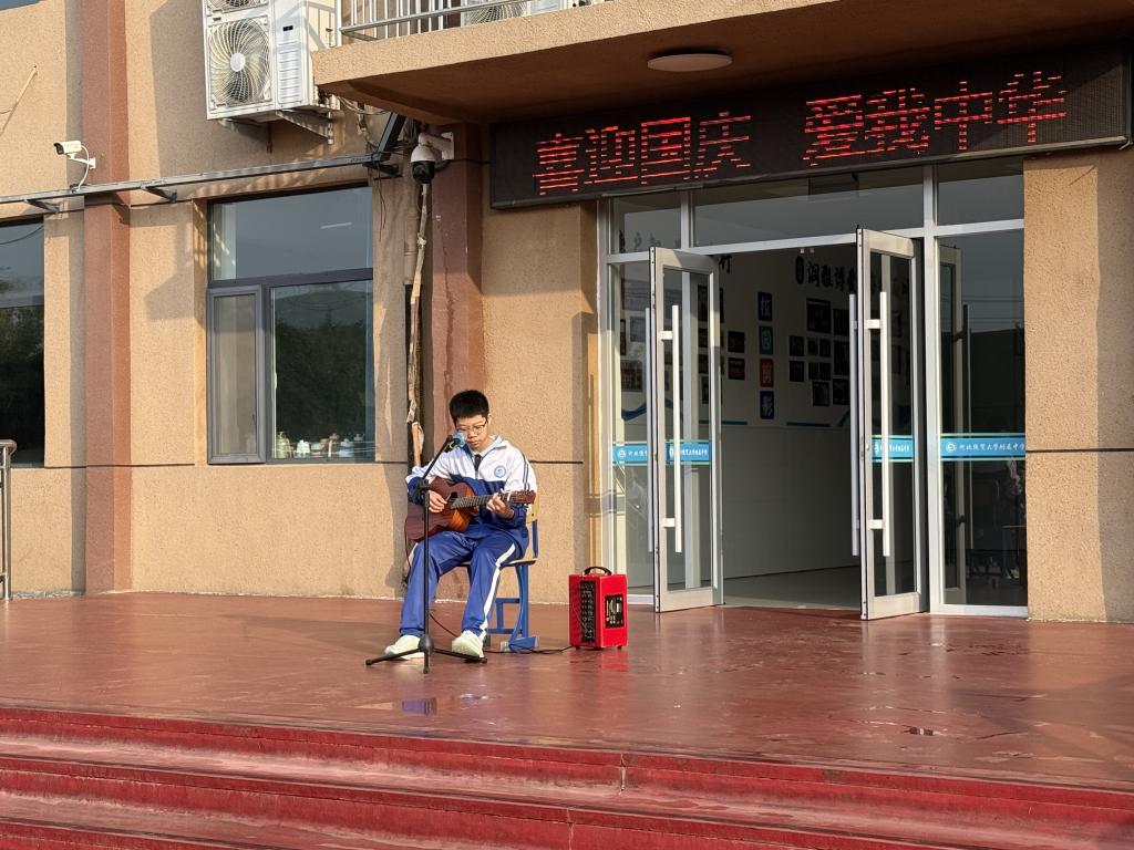 随后,同班的冯天佑同学为全体师生带来了一段精彩的吉他弹奏表演。悠扬的琴声在校园上空回荡,旋律优美动人,展现了经贸大学附中学子多才多艺、全面发展的精神风貌,也为庄严的升旗仪式增添了一抹温馨而活力的艺术色彩。