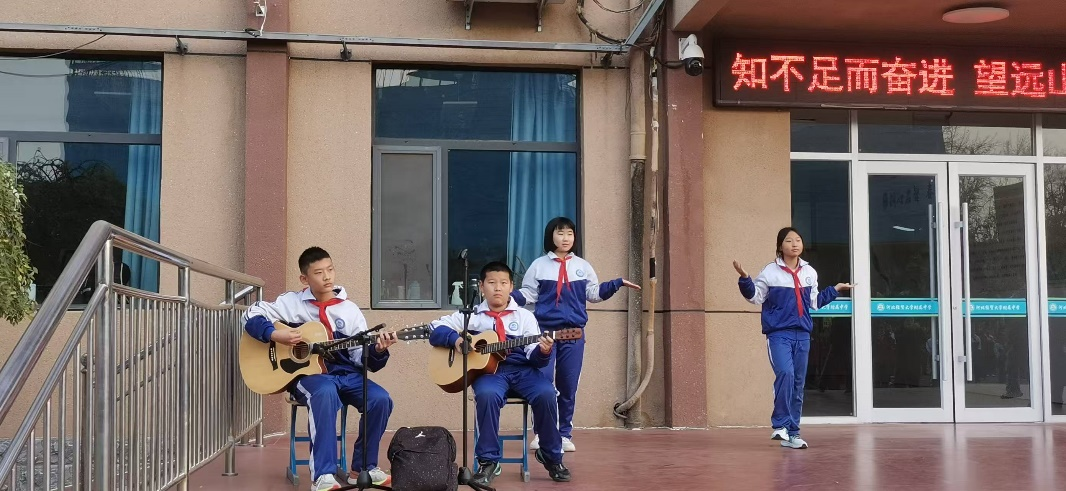 升旗礼毕,创意表演环节惊艳登场。六年级1班的牛子璋、郭佳耀两位同学怀抱吉他登台,指尖轻拨琴弦,熟悉的《童年》旋律缓缓流淌,清澈的弹唱瞬间唤醒全场共鸣,台下师生不自觉地跟着节奏轻声哼唱。灵动的音符勾勒出童年的纯真烂漫,将校园生活的美好娓娓道来。