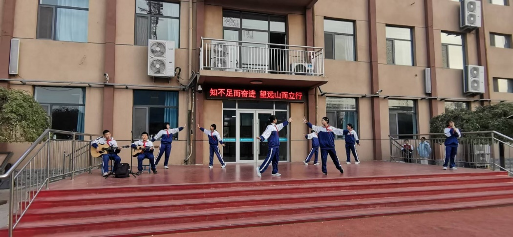 与此同时,丁雨墨等同学为《童年》伴舞。她们的动作轻盈灵动,时而模仿课堂上的专注模样,时而展现课间嬉戏的欢快场景,用生动的肢体语言诠释着童年的无忧无虑与蓬勃朝气。吉他弹唱的悠扬旋律与舞蹈的鲜活身影相互映衬,构成一幅充满青春活力的美好画卷。